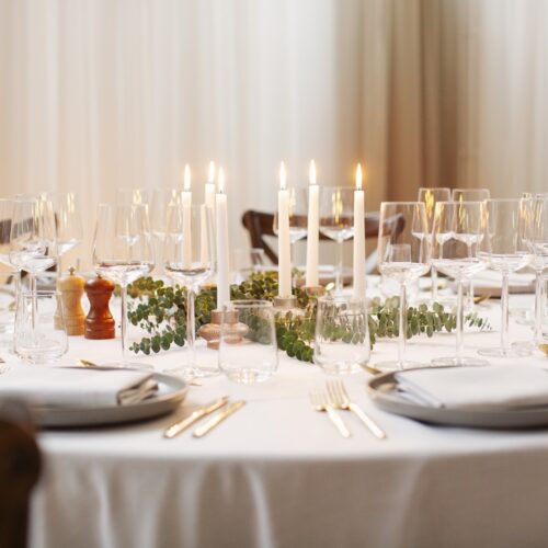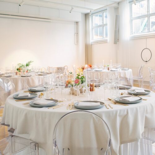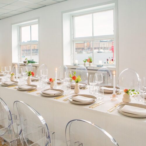 Mindepartementet är en av många trevliga lokaler som tillhör Skeppsholmsgruppen vilka hyr ut lokaler och producerar events på Skeppsholmen i Stockholm. I detta projekt dukade vi upp med Kartells transparanta stol Victoria Ghost, ekologiskat linne och stengods. Iittalas glas från serien Essence och guldbestick gav dukningen känsla av lyx och elegans.