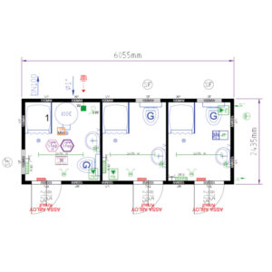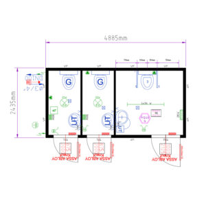 En WC-lösning bestående av tre toaletter och en urinoar med separata dörrar. Toaletterna är riktiga vattentoaletter försedda med handfat och tryckvatten. Containern är uppvärmd och kan användas såväl sommar som vinter.