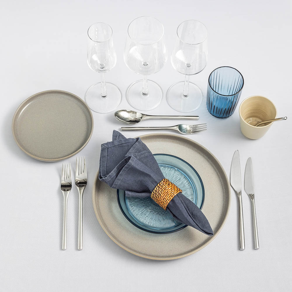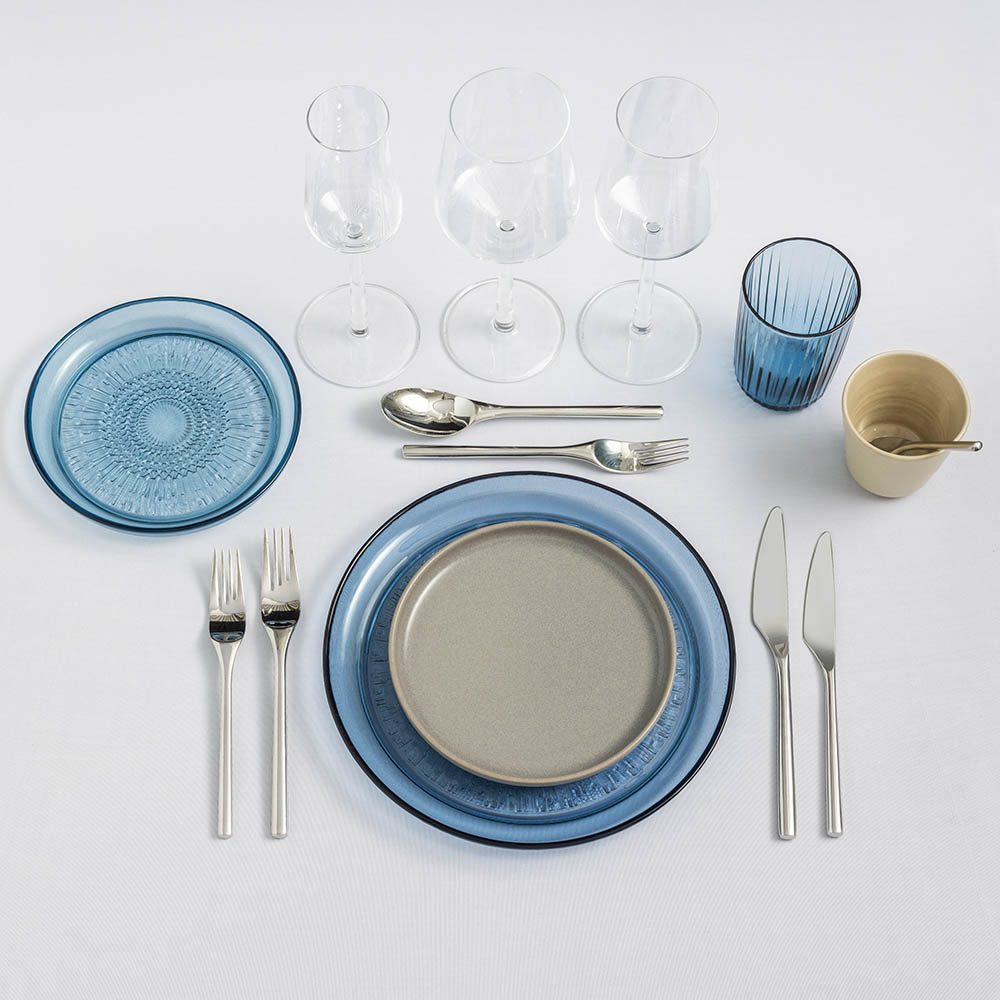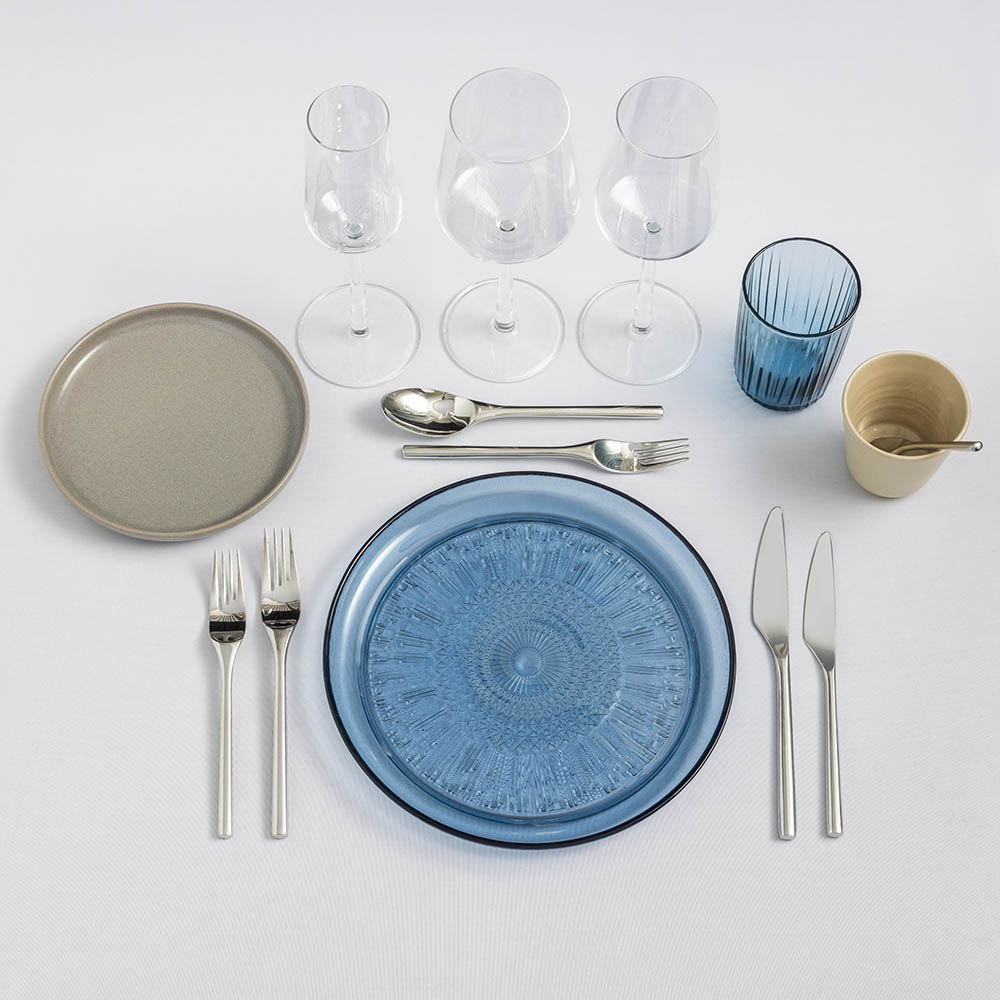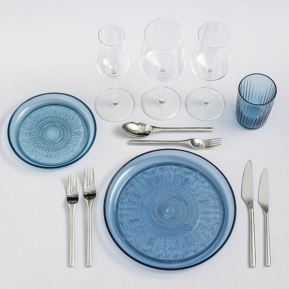Komplett kuvert för servering av 3-rätters middag med grå tallrikar från vår egen stengodsserie ”Nature” och blå glastallrikar samt vattenglas från serien ”Kusintha”. Bestick i serien ”Artik” och vinglas till samtliga serveringar i serien ”Essence”, båda från Iittala. Linneservett i blått från Himla och servettring ingår i priset men bord, stolar och dukar hyrs till separat.