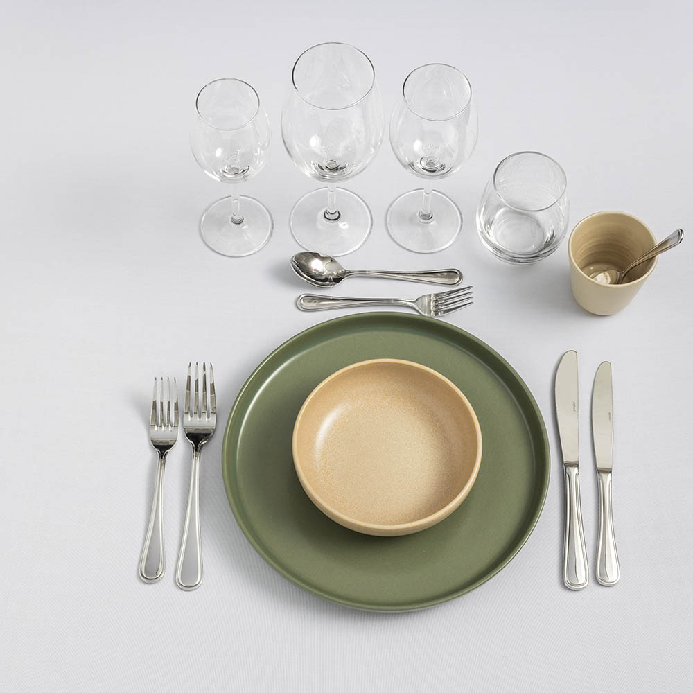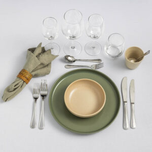 Komplett kuvert för servering av 3-rätters middag med gröna och sandfärgade tallrikar från vår egen stengodsserie ”Nature”. Bestick i serien ”Opera” och vinglas till samtliga serveringar i serien ”Impulse”. Linneservett i grönt från Himla och servettring ingår i priset men bord, stolar och dukar hyrs till separat.